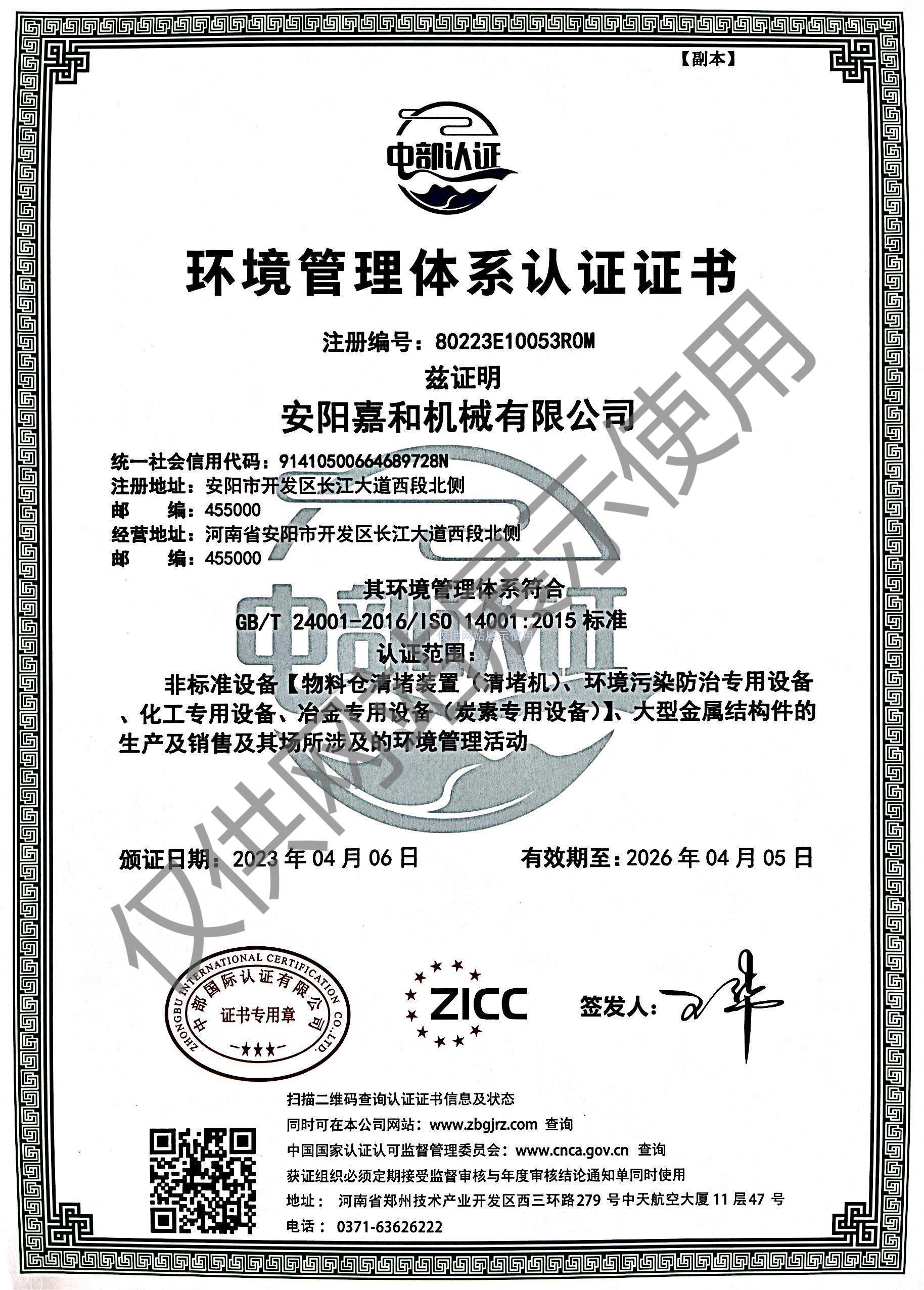 環境管理體系認證證書